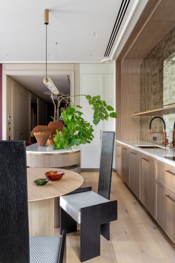 The kitchen is where the Modern Heirloom Apartment really shows off its architecture. Everything feels truly intentional.