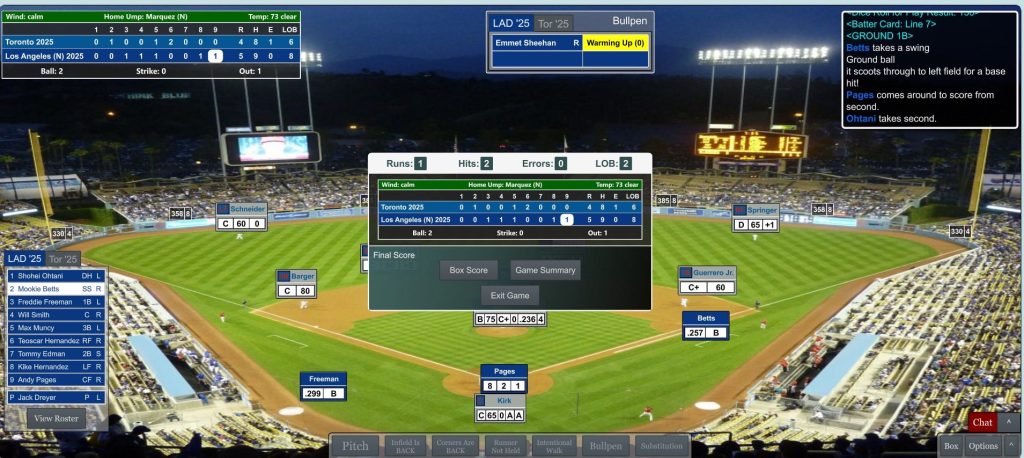 The virtual Blue Jays were seemingly playing with house money after winning the first two games at Dodger Stadium. But the home team wasn’t going to fold, especially with veteran ace Blake Snell on the mound against 22-year-old Trey Yesavage. Meanwhile, all eyes were on each team’s biggest star hitter, both of whom have been struggling at the plate the entire series.
