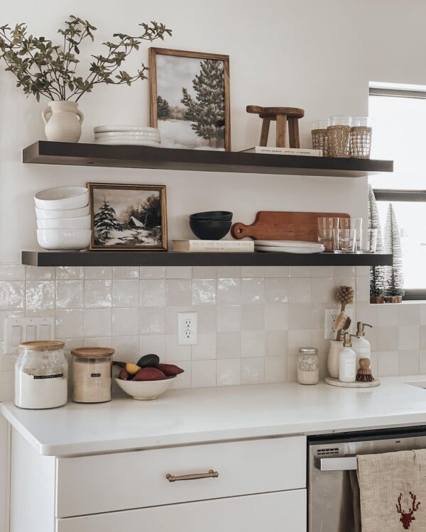 The study is a perfect balance of function and elegance. The warm walnut desk anchors the space, its bold grain giving depth against the soft backdrop. Built-in shelves line the wall behind, displaying carefully placed sculptures and books—styled, yet practical. A leather chair adds comfort without breaking the clean aesthetic.