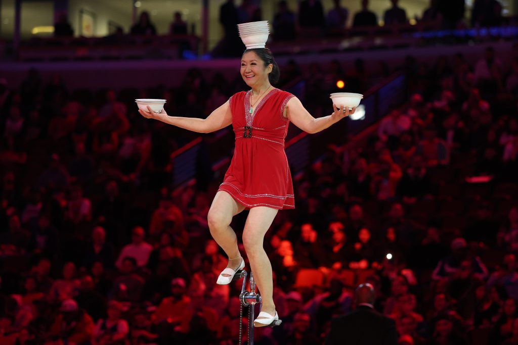 Red Panda is famous for riding her unicycle, which is approximately 8 feet tall, while balancing custom-made bowls on her lower leg before flipping them onto the top of her head. She has been the star of many halftime performances, including during Game 5 of the NBA Finals in Oklahoma City.