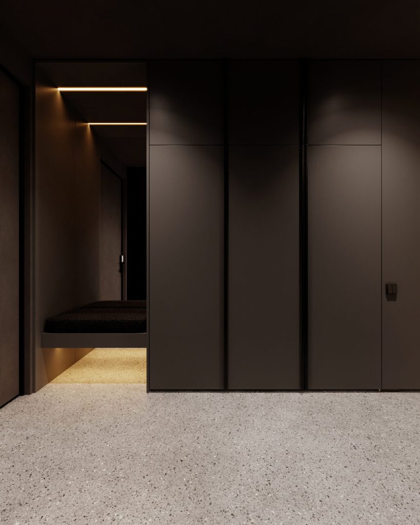 The foyer of The Crimson Studio sets the tone the moment you walk in: dark, quiet, and incredibly composed. There’s no clutter here, no unnecessary detail fighting for attention. Matte cabinetry blends seamlessly with the walls. Simultaneously, soft underlighting beneath the floating bench feels almost cinematic.